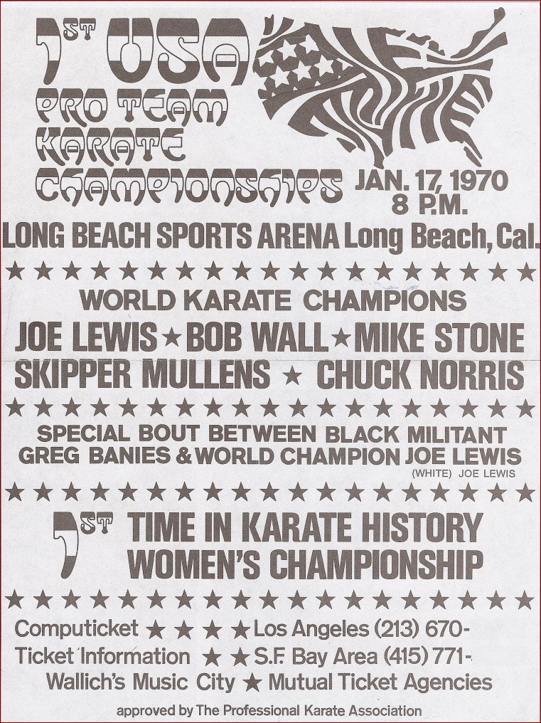 On January 17th, 1970, Lewis knocked out Greg Baines for the US Heavyweight Full-Contact Title. The competitors wore boxing gloves and sneakers. Faulkner initially called his promotional organization the Professional Karate Association, as seen at the bottom of the event poster (Click Here For The First Ever Full Contact Karate Poster), but immediately changed the name to the United States Kickboxing Association. Although Lewis and Faulkner intended at that time to call the new hybrid sport full-contact karate (as opposed to light-contact), the event ring announcer referred to it as kickboxing and the name stuck.