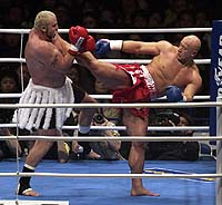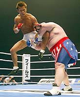 NAGOYA, JAPAN, December 31, 2003: Six of the ten fights will be fought under the new K-1 MMA Rules, including the first bout, which was one of a number of David and Goliath matches on the card. American fighter Butterbean (R, Standing) brought a 100 kg weight advantage into the ring against opponent Genki Sudo (R, Jumping) of Japan. At the pre-event press conference, Butterbean said the match would be "brute strength against skill." Replied Sudo, "I am an expert in MMA, I'll show everyone that skill is greater than power." This time, skill won out. After dancing into the ring with a team of cheerleaders (to the old rock and roll hit Wild Thing!), the wily Sudo deftly drew Butterbean into a game of cat-and-mouse. Sudo kept circling his opponent, staying close to the ropes, then periodically snuck in to hit Butterbean with low Kung Fu kicks. The frustrated Butterbean tried to get a hold of Sudo, who slipped away repeatedly -- on one occasion executing a summersault to narrowly escape. Late in the first, Sudo dove in on Butterbean's leg and got the big guy down. They mixed it up for awhile, Sudo showing that superior skill. Early in the second, Sudo and Butterbean again went to the mat, and here Sudo slipped down to get an ankle hold on, then twisted a bit to submit Butterbean. The crowd loved this fight, and exploded in with delight when Butterbean tapped out.