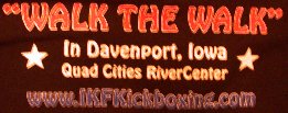 Can't Make As in previous years of this event, there are always fighters who are forced to pull out only weeks if not days before the event for various reasons. Some had no choice when no one else entered their weightclass and or rule style. In most cases, fighters were able to move into different weight divisions and or rule styles, however in some cases, some were not. Although some had no choice, others did but choose to drop out due to scheduling problems, work commitments and other reasons. Why would you not clear your schedule after registering to "Walk The Walk?" It just doesn't seem like they planned ahead which is a shame. Some fighters thought they could work late Friday night and show-up Saturday, or if in a 2 person bracket, show-up on just Sunday. Since the Friday night weigh-ins and rules meeting are mandatory for EVERYONE, this was an unacceptable option for obvious reasons. Finally we had those who were forced to drop out due to training injuries or injuries caused other ways. These are a great shame as well. The event of the year for nearly every USA Amateur fighter, and some can't go because they got hurt in training. The event that would change their lives now will never have a chance to do so... What makes all of these even worse is what happens to the other amateur fighters in the divisions where fighters pull out this late in the game. With plane tickets bought, travel arrangements already made, a simple sorry, no matter how justified the excuse, just never seems to be enough... and it never will. Today alone we lost 3 adult men's fighters and 2 juniors. With 2 days until registration and weigh-ins, we're bound to see a few more drop away. TELL US IF YOUR NOT COMING So if you can't make it, spare yourself the negative press later by please contacting us ahead of time, before Friday so if need be, we can re-arrange division brackets. You can call us at the Radisson Hotel at (563) 322-2200 and simply leave a message or you can e-mail us at MAIN@IKFKickboxing.com Although today we lost more 3 adult men and 2 junior boys bringing our number of fighters is still above last year at 218. 11 more than last year. In 2002, we lost a total of 58 fighters before fight time Saturday morning. As of today, we've lost only 21 for the 2002 Nationals. One of the most tragic losses was of Light Middleweight Full Contact Rules Fighter Kenny Loehr (10-1/8) of St Louis, Missouri. On Sunday evening, July 14th, Kenny was in a serious car accident, that left him with a broken arm, requiring pins, and staples in his head. Not only will he not be participating at nationals this year but he has been told he will never be able to fight again. Our prayers go out to him and his recovery. Than there is the case of our 3 Adult MuayThai Women who were forced to pull out of the event because no other women in the USA were willing to step in the ring and "Walk The Walk" with them. They are Straw-weight Kimberly Tomes of New York, NY (7-1/0), Flyweight Patty Chang of New York, NY and Lightweight Marlowe McCray of San Diego, California (7-3/2). All were ready to bring home the brass, but no one was willing meet them in the ring. For this reason, as far as were all concerned here, these 3 ladies "ARE" the best Women MuayThai fighters in the USA in their weightclasses!!! If there are any doubters that really think they could have took the brass home instead, we ask you, as they would... "Why didn't you have the guts to "Walk The Walk!?" To see who else droppeddropped out and their reasons, just