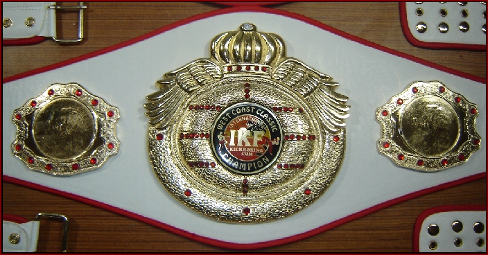 Well, the IKF WCC will offer just that, a full weekend of the best Amateur Muay Thai Kickboxing action on the planet! Kids as young as eight years old...yes, eight... will be fighting for sport and the honor of wearing a championship belt that almost covers their entire torso and weighs almost as much as they do...oh well, kinda! :) Women will do battle with one intent...to walk out of that ring with one of those white and gold belts around their athletic waistlines! The mens division as always will be packed with some of the best talent from around the country! Men, both young and old, heavy and light will get their opportunity to battle for beautiful belts revealed only a few days ago by us. (Pictured Right)