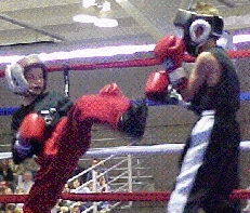 The match-up for the main event with Marinoble was probably the least of promoter Tim Stell's worries though last night. As mentioned, the crowd was very small due to a lack of advertising for the event but a large crowd was never expected since it was only scheduled to be a small amateur, non title event. With the help of the California State Athletic Commission and the IKF staff, the other problems were delt with and handled well to keep the event going. Dave Marinoble (Mike's brother, IKF Pro North American Champion) helped Stell out tremendously by bringing some of his students to fill time between bouts. One who impressed everyone greatly was Justin Ewen. Ewen (Youth Director Marinoble's Karate & Kickboxing) is a World Kata Champion and from the looks of his free-form acrobatic musical Kata and weapons demonstration he performed on the night, we hope to see "A LOT" more of him at future events! Later Ewen did a 2 round kickboxing exhibition bout with fellow student Robert Elledge. Elledge was scheduled to fight on the card but his opponent came in overweight at the weigh-ins eliminating him from the nights event.