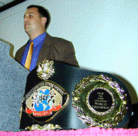At about 5:30 and we went to work on the real reason we were here, to win a title. We knew we were in our opponents backyard and we would have to make sure that we won this fight in grand style and grand style it was. The Pitbull (Preacher) was out for blood. After a most inspiring introduction by "SKY" the ring announcer, who by the way was the best announcer I had the pleasure hearing, we made our way to the ring where the "looks" and "psyche" game continued. All we had to do is stick to our plan (which I won't disclose for I know THEY are reading this) and take home the bacon.