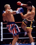 IKF In probably one of the greatest bouts of his career, Rick "The Jet" Roufus quieted all his critics in May of 1999 when he defeated Australia's Stan Longinidis by TKO to win the IKF International Rules Heavyweight WORLD Title. Being new to the leg kick game, Roufus was the underdog to many critics against the experienced leg kick Champion Longinidis. In the end, Longinidis couldn't answer the bell for the 10th round due to a broken foot. The broken foot though didn't show the true damage Roufus had put on him during the 9 rounds fought. These pictures on this page reflect some of Roufus' shining moments. At the time of the stop, Roufus was ahead on all 3 judges cards, 89-81, 88-81 and 86-83. Longinidis was competitive in rounds 1-4 where the scores were 40-36 Longinidis, 39-38 Roufus and the final judge having it 38-38 even. However, in round 5, Roufus landed a head kick (Shown several times below) which dropped Longinidis hard. After it, Longinidis was never the same and never won another round on any judges cards. | |