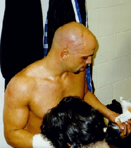 When it was all over, everyone could see the damage Roufus had did to Longinidis (Below). Although the bout was a true war between TWO GREAT FIGHTERS, Roufus on the other hand didn't seem to have a mark on him... | |