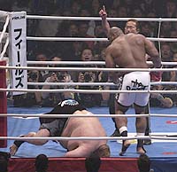 Akebono came back with another pushing attack, but Sapp answered this with a left straight punch and then a right hook to put the big guy down for good.