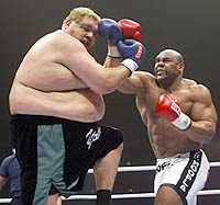 "The Beast" threw some nice low kicks, and when a fatigued Akebono relaxed his guard, got a solid left punch through that stunned the Sumo wrestler. It was a right hook that sent Akebono to the canvas for the first down. But to his credit, Akebono struggled to his feet to beat the count.