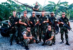 A former Corporal in the U.S. Marine Corps (Left) elite Recon Unit (1993-97), Johnson saw active duty overseeing peacekeeping efforts in Port au Prince, Haiti, (Right) worked security with the U.S. Border Patrol's Joint Task Force in Mexico and toured Scotland and England, where he trained with the prestigious British Royal Marines.