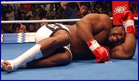 At 6' 7" tall and 374 lbs, very few thought he could be stopped but this last weekend, Bob Sapp, (Pictured at right & below) the big hype for K-1 was stopped BIG! At the K-1 show in Omiya at Saitama Super Arena, Mirko "Cro Cop" Filipovic (Left, 6'2, 227lbs) had little trouble in defeating Sapp in the 1st round in 1 minute, 26 seconds by KO from a straight left punch. Once Sapp hit the mat, he couldn't move and the 10-count was given for the KO win to Filipovic, as Mirko jumped up and down in the ring from excitement. Sapp was taken to the hospital in Saitama right after and it's confirmed that he did in fact suffer a broken eye socket. He bled under the crushed eye socket and in fact started tearing up. The Japanese media billed Mirko's win over Sapp as if a normal human being had defeated Godzilla. Excuses were made in the papers that Sapp had no time to train because he was spending 15 hours a day for publicity work. K-1 matchmaker Sadaharu Tanigawa said that he has all intentions of booking a re-match between Filipovic and Sapp. Sapp is out for at least six weeks after suffering a fractured right eye socket and a lacerated eyelid and is not expected to fight this coming May 2nd in Las Vegas, Nevada. Especially since the KO is well inside the International Rule of a 45 day KO/TKO suspension, something the K-1 organization is sure not to ignore. He has cancelled all future publicity events in Tokyo for the near future and was not at K-1's press conference on Monday. He made his first public appearance in Tokyo since getting KO'd (Right) wearing a pirate patch over his eye and said that he would be willing to confront Mirko in a PRIDE ring, saying "With that policeman guy, I'll fight him again and finish him." He said that Mirko got lucky with his straight left punch and that the punch was a one-in-10,000 shot of KOing him. For more on the story see the K-1 USA page by clicking HERE. That 45 day KO/TKO Suspension rule looks like it will cause even more damage at K-1 USA this coming May. As of 3-24-03 the tournament consisted of; Sapp, Michael McDonald, Rick Roufus, Dewey Cooper, Giuseppe DeNatale, Chad Bannon, Jefferson Silvia and Carter Williams. However, at the same event Sapp got KO'ed on, Ernesto Hoost KO'ed Silva (See Right) at 2:55 of round 1 so he's out of the line-up now too. Worse yet, the word on the street is that Chad Bannon (Venice, California, USA) will be fighting this weekend. Lets hope he doesn't meet the same fate as Sapp and Silva... Bannon has been an actor and stuntman on the show Battle Dome. Our question is, "Why would these fighters take such a risk fighting so close to another high profile event?" Oh well, looks like they will learn their lesson now... |