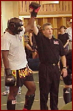 We here at the IKF find is a shame when a fighter such as Carter Williams (Right), or better yet FIGHTER'S fight their hearts out and in the end, no one hears about it. Such is the case with a recent event held in Villa Park, Illinois, USA where 8 American Heavy and Super Heavyweights hooked up to "Walk The Walk" for a major Grand Prize. A prize larger than May's K-1 event. "$10,000.00!" However, despite the final prize, as we mentioned, "Who knew about it?". As one person recently wrote of his accounts of the event, "Promoters, Too Famous Inc. were the latest addition to the Hall of Fame of failed events. With a marketing strategy lifted from the storyline of Filed of Dreams, they built it.........but nobody came." This was a shame considering those who fought in the event. The same person went on to say, "The fact that the event suffered two major delays before beginning did not seem to anger the two hundred or so hard-core fans that actually found out about the event and then actually found their way to the venue." Although few were there to witness it, we here at the IKF would like to congratulate Carter on yet another Tournament win and wish him the best of luck in future bouts. We would also like to give credit to those other fighters who fought and received no recognition. Here were the results of the 8 man tournament, bout by bout.