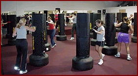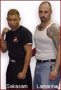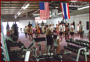 Those who are familiar to the IKF News page here are probably expecting a story here about some great MuayThai fights from last weekends Salt Lake City Utah event. Well, those stories are coming, but first, we need to tell you about something else... As many would know, we have been all over the world and seem a countless number of kickboxing, muay thai, and karate schools and gyms. In this time, we have seen some GREAT Ones! Well, no offense to all you gym owners out there (which we are one of you too), but you all need to go to Salt Lake City, Utah if you want to see what we are calling "THE BEST" Kickboxing Facility in the WORLD! Did we say that out loud? Why yes we did. Our adventures this last weekend took us to Salt Lake, Utah. Yes, Utah. Once there we met up with IKF promoter Craig Lamanna who drove us to the headquarters of MuayThai Institute of Kunponli. An impressively massive 20,000 square foot facility that will make us all jealous! Yes, ALL OF US! We did an article on this gym back in June of 2002, but words and an article alone did not prepare us for what we saw! Lamanna's facility includes a 10,000 square foot Muay Thai training room (Left) equipped with all the necessary equipment from bags to the ring. But wait, lets go back to the front door and tell you about the full lobby with some sit down tables and massive pro shop featuring Lamanna's own equipment line, AirMonkey fight gear and of course, weight lifting accessories, and aerobic gear. Not to mention the coffee machine that makes a fresh brew to wake you up at the 6AM (8AM weekends) opening time and oh, did we mention this place is open "SEVEN" days a week! They have classes scheduled every day of the week except Sunday. Moving forward into the club we enter the weightroom with a full Olympic weight center, featuring Hammer Strength (Right) and Life Fitness equipment and a huge assortment of free weights. Lets move on to the full cardio center with Life Fitness and Tectrix equipment. Keep walking and you find yourself in the aerobics room (Left) where they feature classes like Boot Camp and Jump & Jab along with yoga. Keep in mind MuayThai is not the only thing these guys offer. Lamanna is also an instructor for the local law enforcement and is a specialist in weapons and close quarters combat, "Reality Style!" Move down the hallway and you will find several "Live-In" dorm rooms with bunkbeds to sleep in. Yes, if you come here to train from out of state, you can save the hotel fee and sleep right in the gym. Just bring bedding and anything else you need. A few more steps down the hall and you come to the full kitchen for preparing those real Thai meals. And we mean REAL! Not just because it's Thai recipes, but our cook for the night was none other than their chief MuayThai trainers wife straight from Thailand. And who runs the Thai training here? How about multi time World Champion Sakasem "The Punisher" Kanthawong! But before we brag on Sakasem, lets finish the tour. Did we mention the Thai lounge complete with a direct satellite feed from Thailand to feature Thai TV and live Thai Fights! Don't forget the full tiled locker rooms with showers and to keep things clean, there is even a washer and dryer for you. We are not the first to brag about Lamanna's facility. Grappling Magazine (March 2003) says, "Lamanna has broken new ground in developing a mixture of muay Thai and Western fitness in one of the largest facilities of its kind internationally." Which on that note, lets get to last Saturday nights fights! The nights action started with two 65 lb Junior MuayThai fighters. Although J. D. Filiaga and Timothy "Junior" Ruesga were both from the Muay Thai Institute, these two had planned to go at it full power and we had all planned to score the bout. However, a small missing piece of equipment (Cup) brought this bout down to just an exhibition. But this didn't seem to change things in their game plans. These two still put on an action packed MuayThai bout! Hopefully, these two will make the trip to the IKF Amateur Tournament this year to face off against some of the other top Junior MuayThai & Leg Kick fighters from gyms like Dean Lessei's out of Illinois. Oh and Dean, you and Craig need to Hook UP! You will fall in love with his facility! Craig needs to get you on one of his cards along with other IKF MuayThai gyms like Mick Doyles, Ryan Blackorby's and of course, Uncle Brooks needs to make a road trip to Utah! None of these bouts were short of Great MuayThai action so we were fully entertained from the start. Jose Garcia from Master Toddy's Gym in Las Vegas, Nevada, USA (2-0/0, 156, 5'6", 36) and Ryan Luper of Salt Lake City, Utah, USA trained by Sakasam (0-1, 156, 6', 25) kept things going! This was Luper's fight debut but with great training from Sakasam, he looked like a seasoned veteran. However, so did Garcia. Coming from Master Toddy's gym in Vegas pretty much speaks for itself and this being his second time in the ring, the one extra bout gave him the composure he needed. Garcia wins this one, by unanimous decision, 29-28, 29-28, 30-28. The third bout or second real fight of the night (Not that the Junior boys didn't ROCK!) featured Marcus Kimsey of Salt Lake City, Utah, USA (1-0/0, 160, 6'3", 27) trained by Sakasam against someone we will call "Dr. BLUE", Bruce Sherrod of San Francisco, California, USA (0-1/0, 163, 5'7", 32) Why "Dr. Blue"? Well, Sherrod came to the ring with his hair in locks and BLUE! (Which looked pretty cool actually!) With that kind of hairdo, you better be able to fight, and Sherrod had no problem there. Sherrod is trained by yet another legend, Bunkerd Faphmai (formally Fairtex) who recently announced his retirement. However, both Boonkerd and Sakasam, both into their 40's looked and moved like they could step into the ring today and give us all a lesson in Thai! These guys are that good! Kimsey and Sherrod went toe to toe for all three rounds and in the end, it was Sakasam's trainin