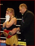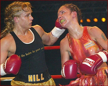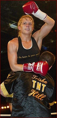 southwestern Germany, they will only remember her as the Girl with the That's because on Saturday, Feb. 14, 2004 the former multi time IKF National Amateur Champion Trisha "TNT" Hill defeated the German World Title Holder Silke Weickenmeier to take her WIBF (Womens International Boxing Federation) Featherweight World Title by TKO in the 7th round!
