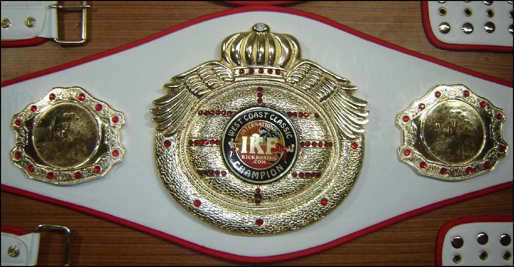 Well, the IKF WCC will offer just that, a full weekend of the best Amateur Muay Thai Kickboxing action on the planet! Kids as young as eight years old...yes, eight... will be fighting for sport and the honor of wearing a championship belt that almost covers their entire torso and weighs almost as much as they do...oh well, kinda! :) Women will do battle with one intent...to walk out of that ring with one of those white and gold belts around their athletic waistlines! The mens division as always will be packed with some of the best talent from around the country! Men, both young and old, heavy and light will get their opportunity to battle for beautiful belts revealed only a few days ago by us. (Pictured Right)