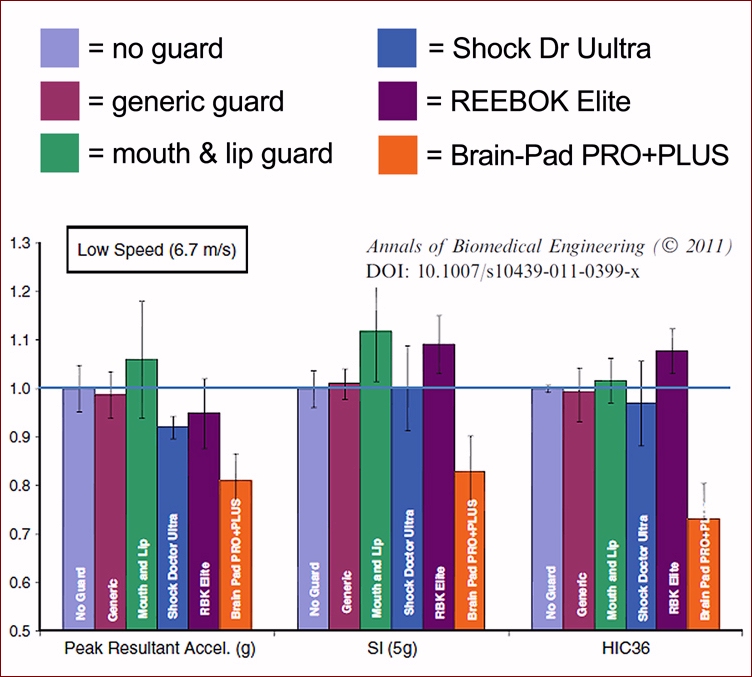 Funded Below is the NFL funded mouth guard testing and analysis on the major (Mouth Guard) brands in the industry. As you will see as far as impact forces being transferred to the head, the upper mouth guards actually accelerated impact forces compared to wearing no mouth guard at all. Only the Brain-Pad Jaw-Joint Protector reduced impact forces being transferred to the head. This testing assures individuals who wear the Brain-Pad Jaw-Joint Protector are protected by the finest protection currently on the market.
